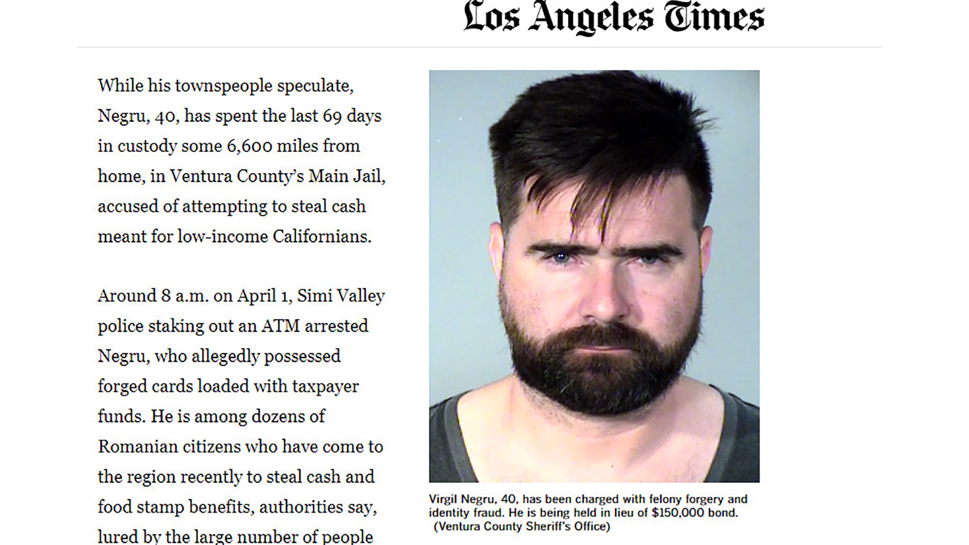 Pe 1 aprilie, în jurul orei 8 dimineața, poliția din Simi Valley, care supraveghea un bancomat, l-a arestat pe Negru, care ar fi deținut carduri false încărcate cu fonduri ale contribuabililor. El se numără printre zecile de cetățeni români care au venit recent în regiune pentru a fura bani și bonuri de masă, spun autoritățile, atrași de numărul mare de persoane care beneficiază de asistență publică și de securitatea slabă a cardurilor pe care statul le folosește pentru a distribui banii.