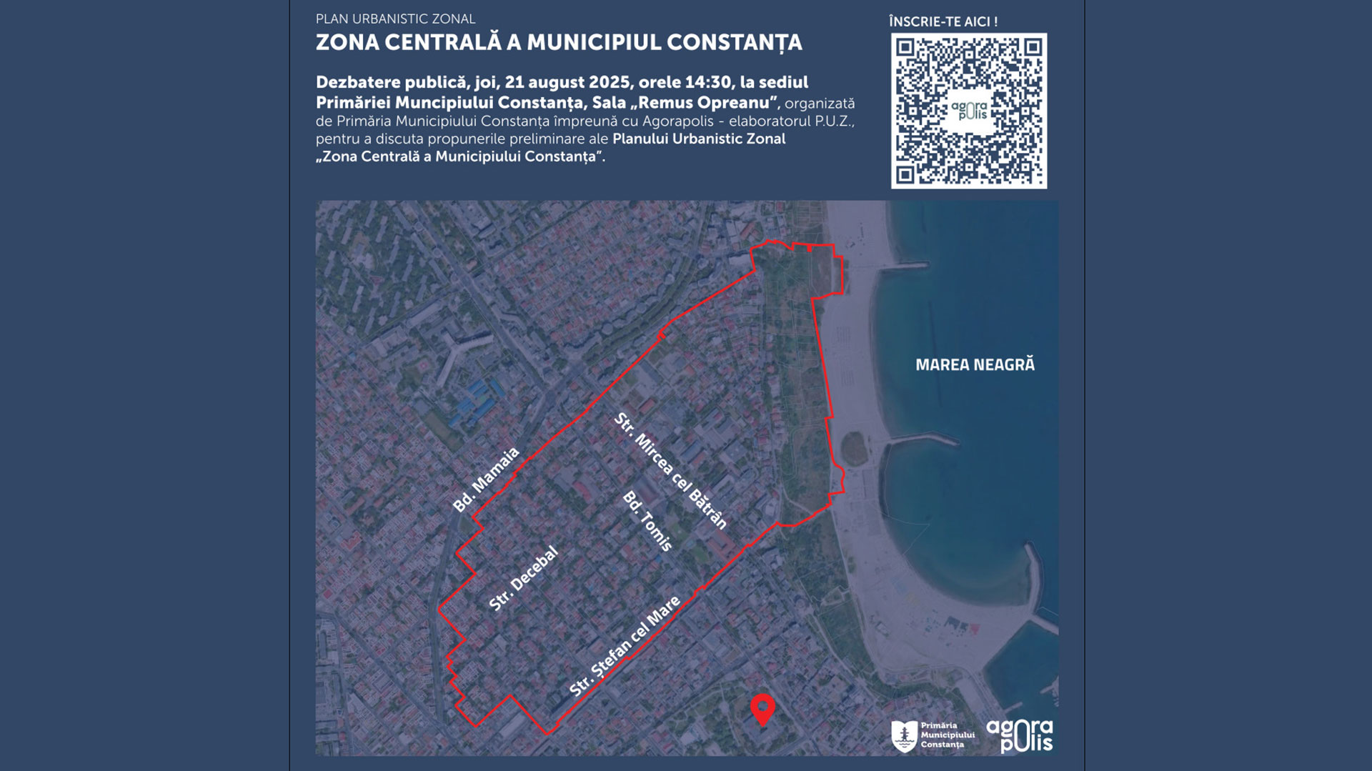 Totodată, ședința de dezbatere publică va avea loc la sediul Primăriei Constanța, în Sala Remus Opreanu, situată pe Bulevardul Tomis nr. 51, în data de 21 august 2025, între orele 14:30 – 15:30.